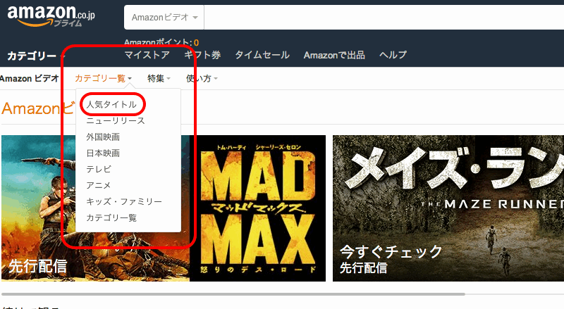 「Amazon ビデオ」のトップページの「カテゴリ一覧」の中から見たいジャンルを選びます。今回は「人気タイトル」を選んでみました。