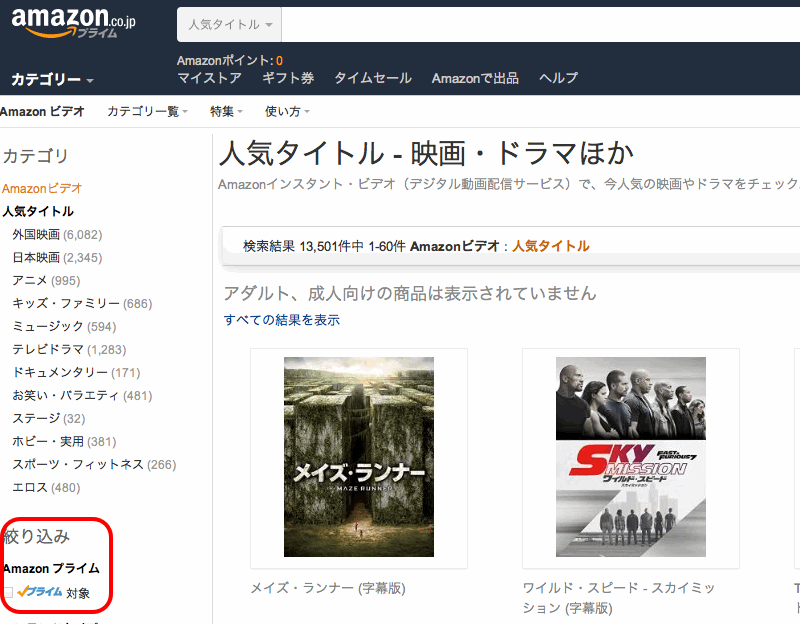 こちらにチェックを入れると、プライム対象のタイトルに絞った検索結果となります。