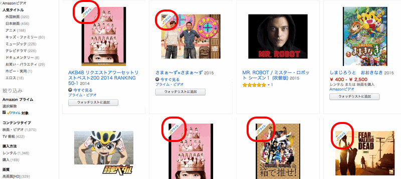 この「プライム」マークがついたタイトルが対象商品で、無料で見ることができます。