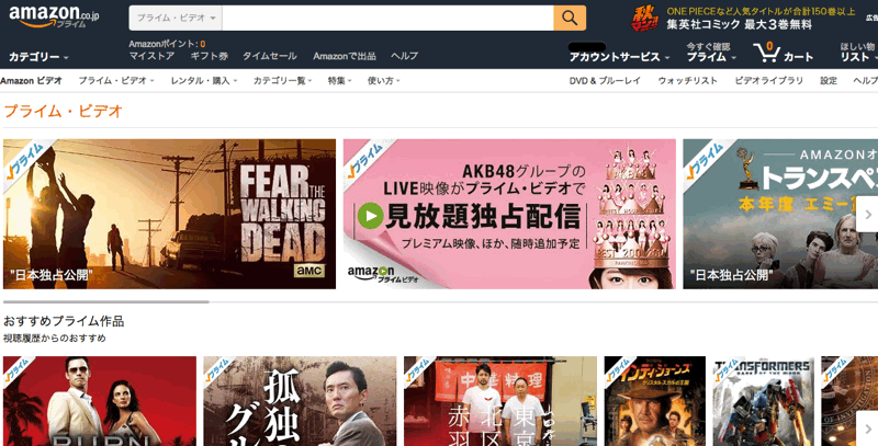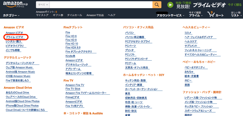 以前の話題で対応タイトルの検索が面倒だと話題にしましたが、それはサービス開始の初日だけで、現在では「Amazon」のサイトのカテゴリー内に「プライム・ビデオ」という項目が設けられ、検索しやすくなりました。