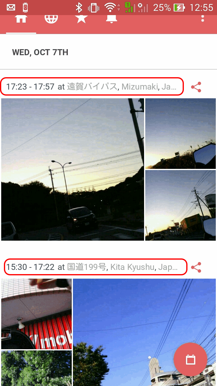 サーバー転送時に場所や移動速度などから、サーバー側で適当に写真を整理してファイル化してくれます。
