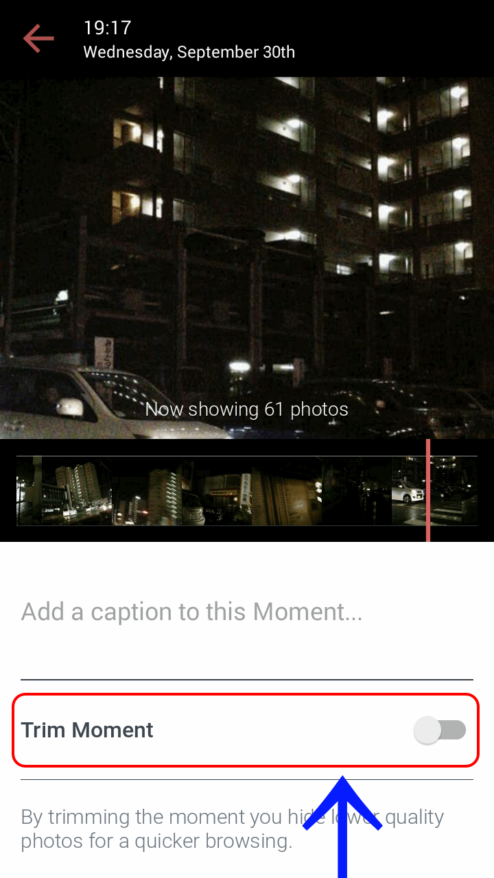 全て表示するためには画面下から上にスワイプして「オプション表示」を出し、「Trim Moment」のチェックを外します。