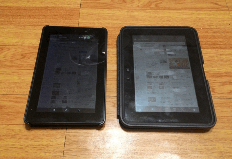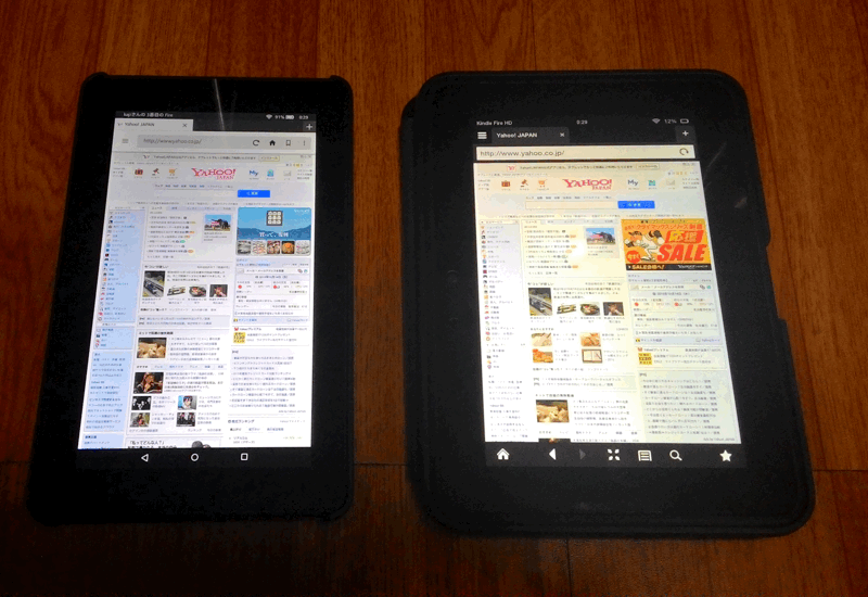 次に、「Kindle Fire HD」と「Fire タブレット 8GB」の液晶を比べてみました。
