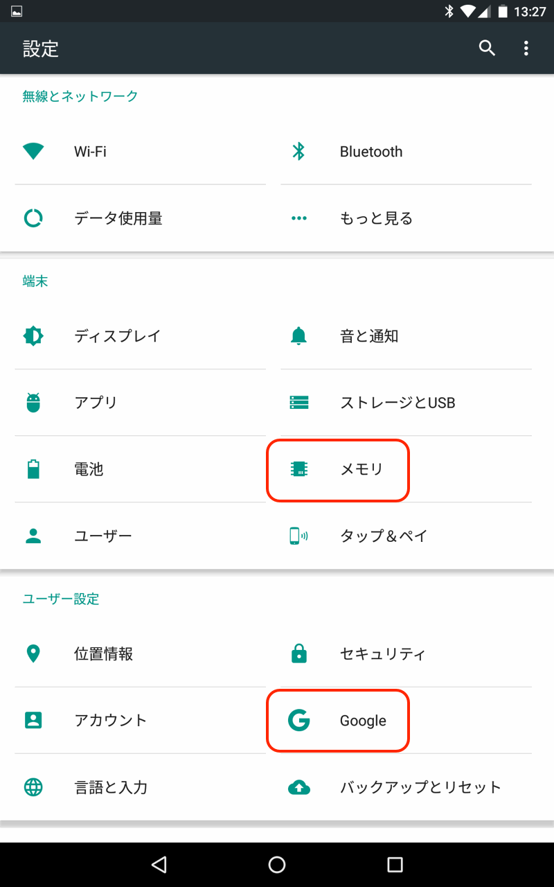 ▼ 端末 の項目に 「メモリ」