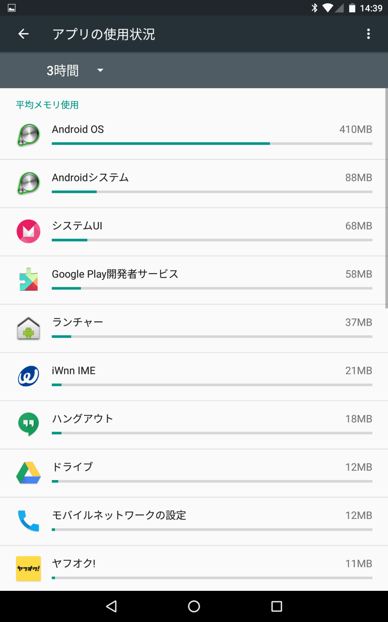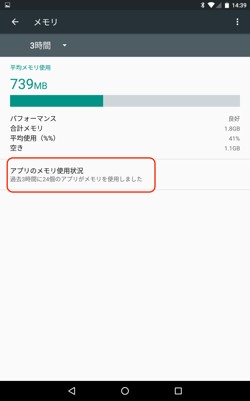 また、「アプリのメモリ使用状況」をタップすることで、各アプリケーションの使用量も確認できるようになっています。