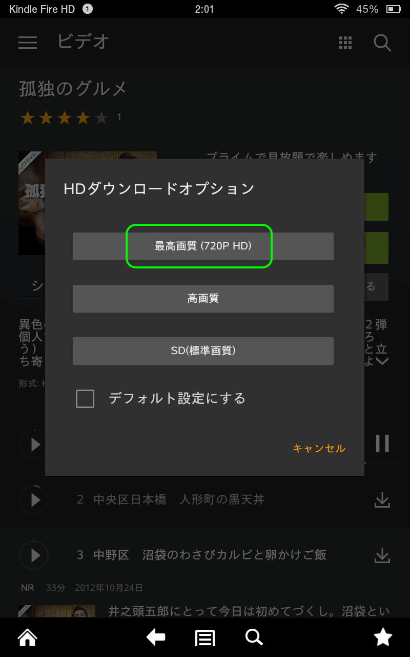 今回、新型の「Fire タブレット 8GB」で試しましたが、「Fire HD」タブレットの場合、HD画質でのダウンロードも可能なんです。