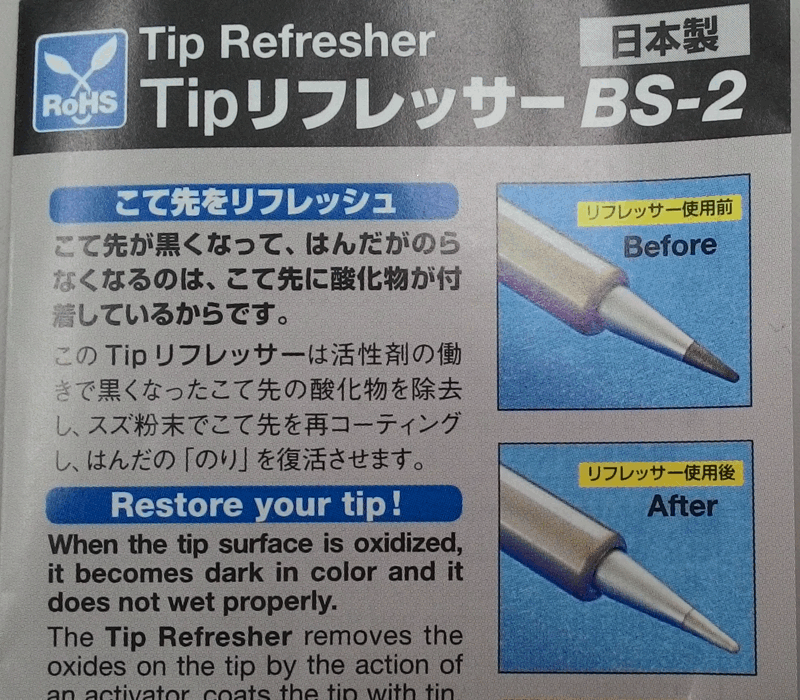 最後に、コーティングに「Tipリフレッサー」は使用前に完全に拭き取るように注意書きがありました。プリント基板等では腐食させてしまう可能性があるようです。