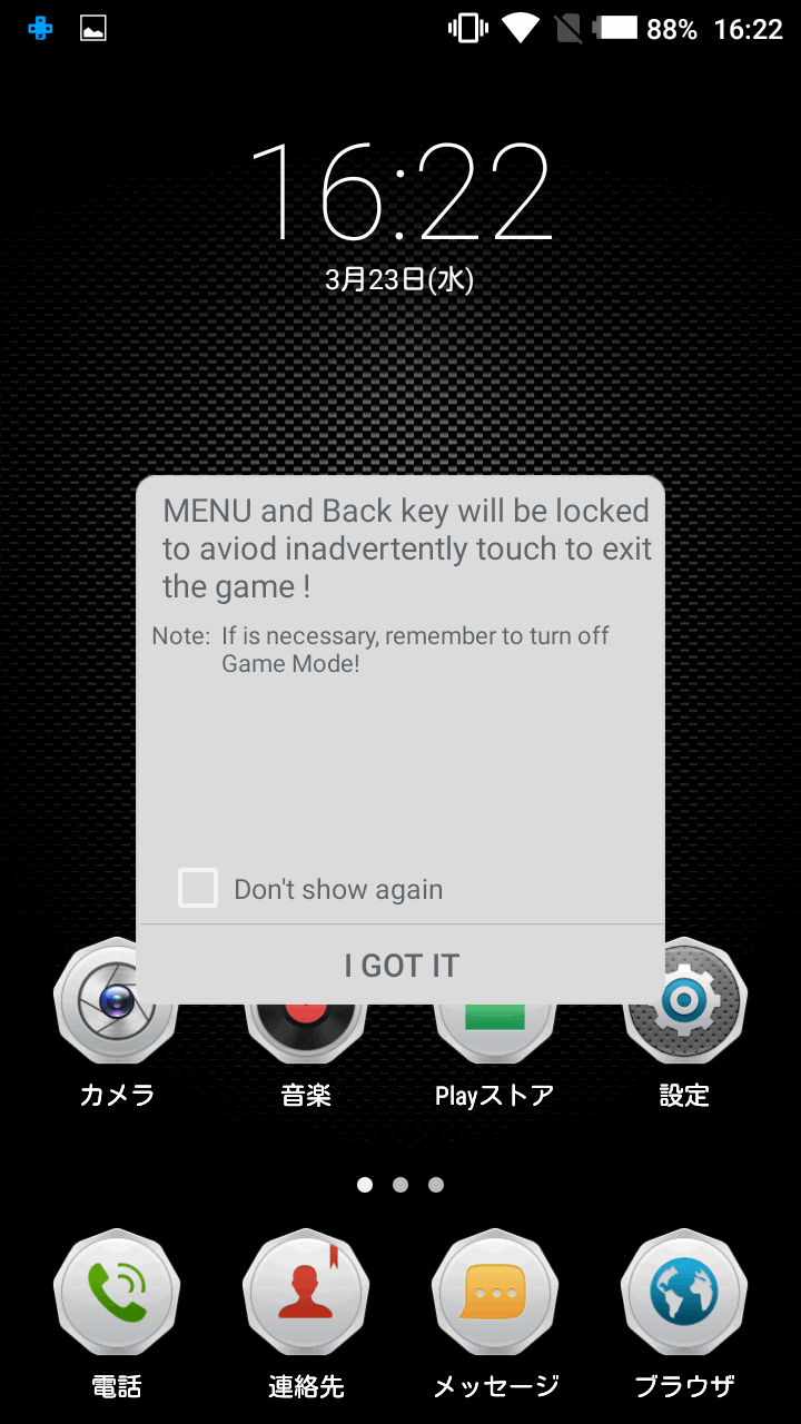 「Game Mode」をONにすると、端末のメニューボタンが無効になります。