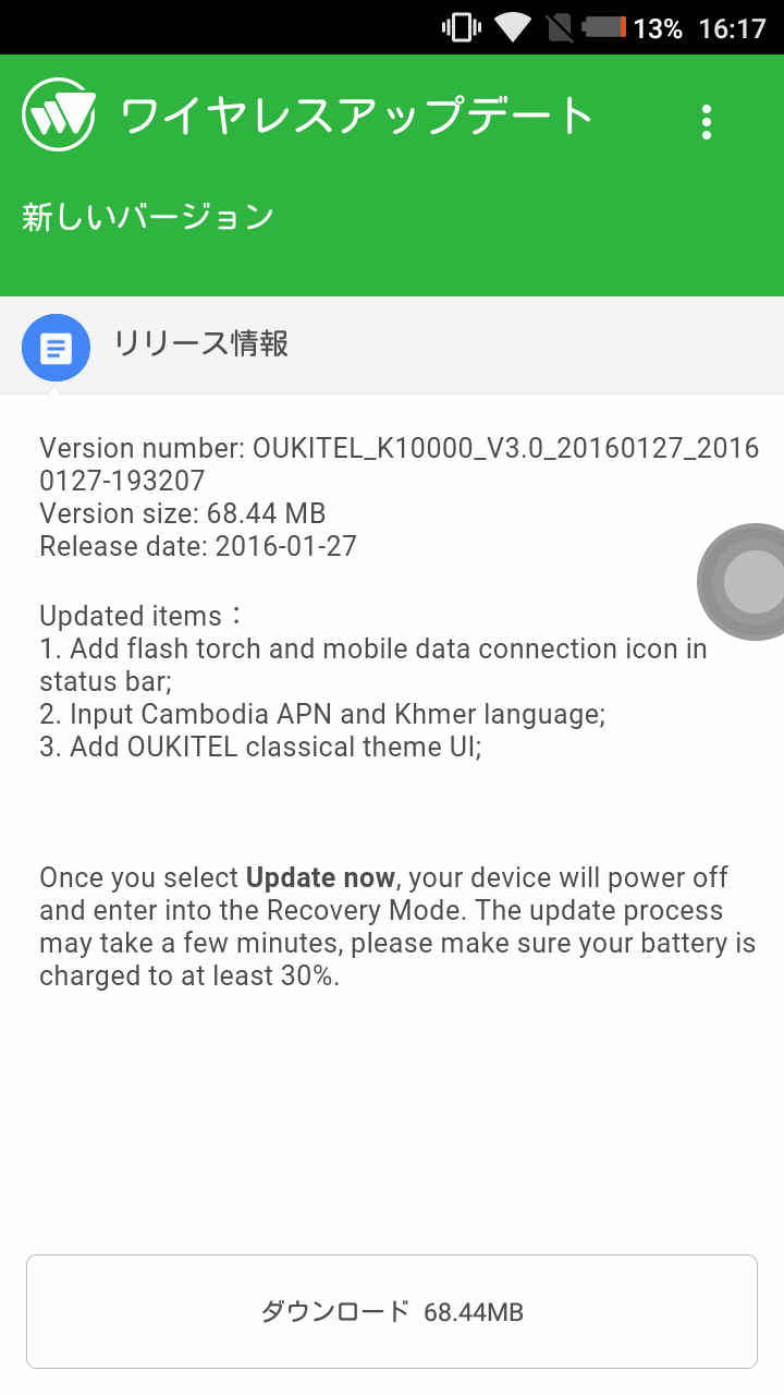 それから、この機種のアップデートですが、「ワイヤレスアップデート」というアプリが用意されていました。
