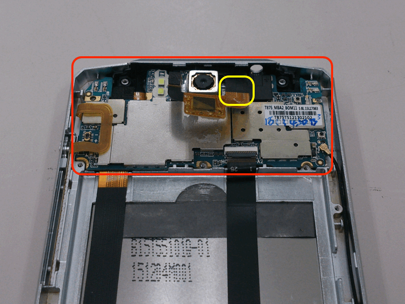 上の画像の赤い部分に接着剤で固定されています。液晶のケーブルはボードを少しずらせば外せました。