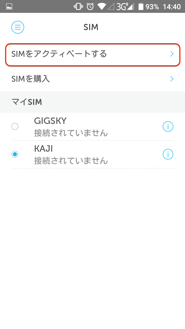 ここで「SIMをアクティベートする」を選択し、SIMカードの台紙に記載されている「アクティベーションコード」を入力することで、使用できるようになりました。