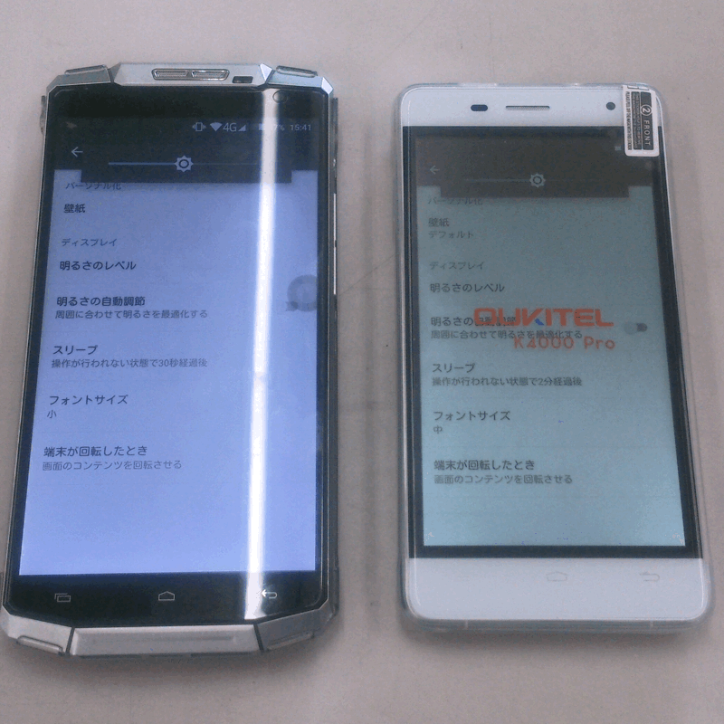 ディスプレイは強化ガラス使用のため、「OUKITEL K10000」と同じ輝度で比べると暗く感じます。