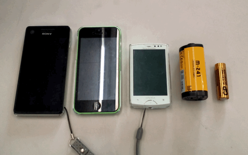 電池と比べると、そんなに大きく感じません。次に、スマホと比べてみます。