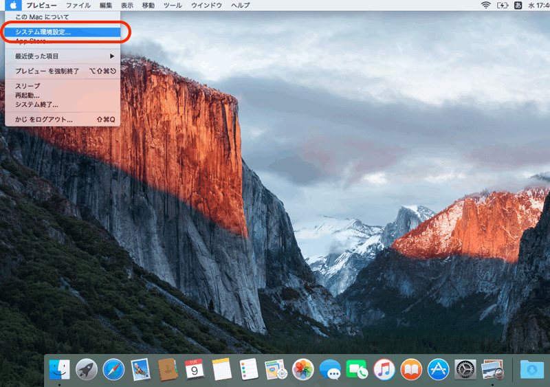 左上のリンゴマークから「環境設定」を表示させます。