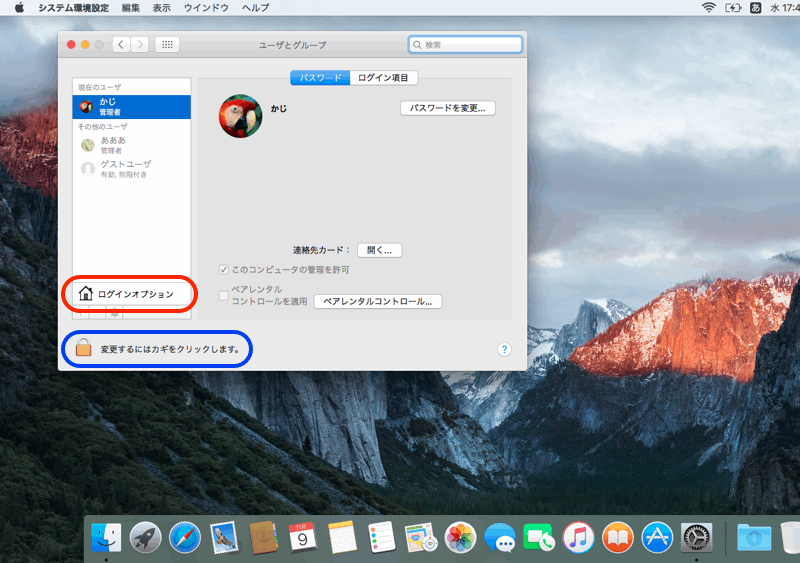 この画面は、ロックがかかっている場合がありますので、その場合は左下の鍵のマークをクリックしてロックを解除します。(解除の際にパスワード入力が必要です。)