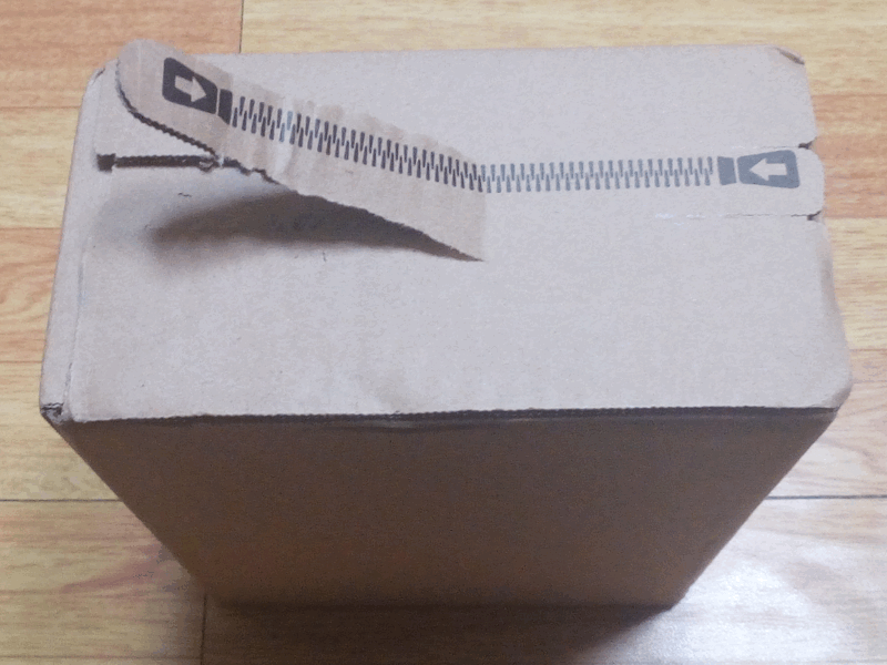 到着した商品を確認すると、しっかりとした段ボールに入っています。ちゃんと開け口も用意された段ボール。