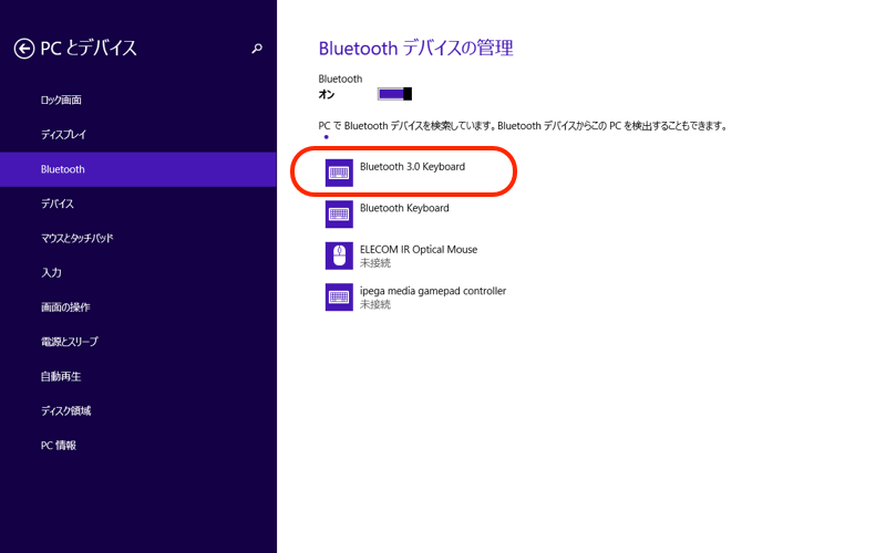 このキーボードですが、「Windows 8.1」環境でペアリングしてみると、「Bluetooth 3.0 Keyboard」という名称で接続されました。