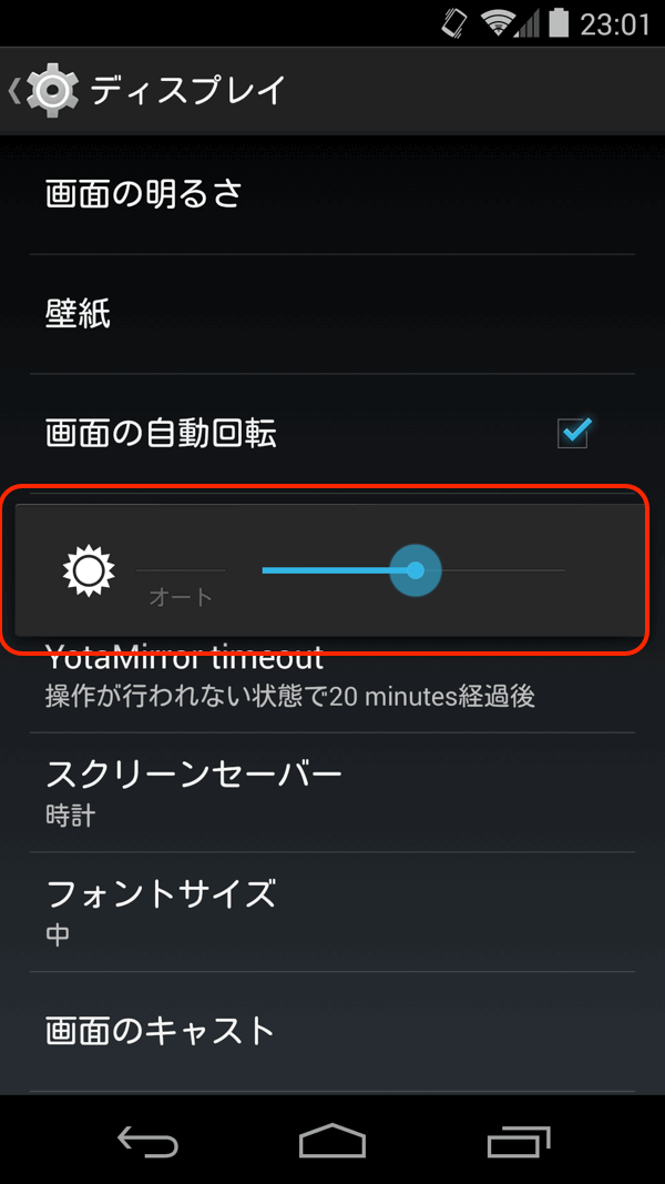 ディスプレイの自動輝度調整機能は「OFF」にしておきます。