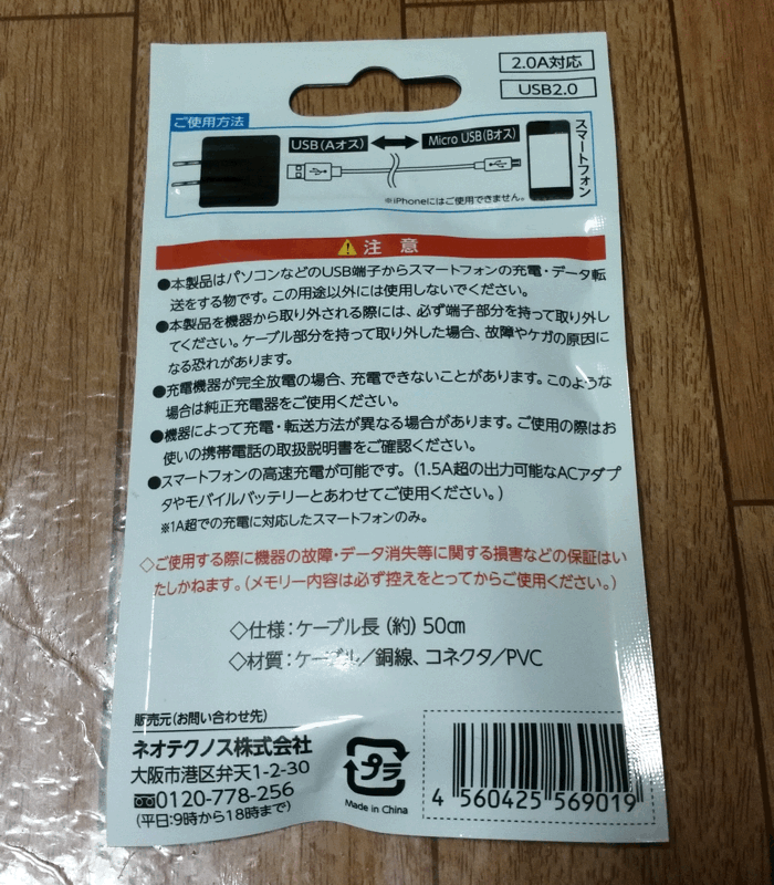 「Micro USB」側が、ちょっと長めのケーブルをお探しの方は100円ショップの「Seria(セリア)」に行ってみてはいかがでしょうか??