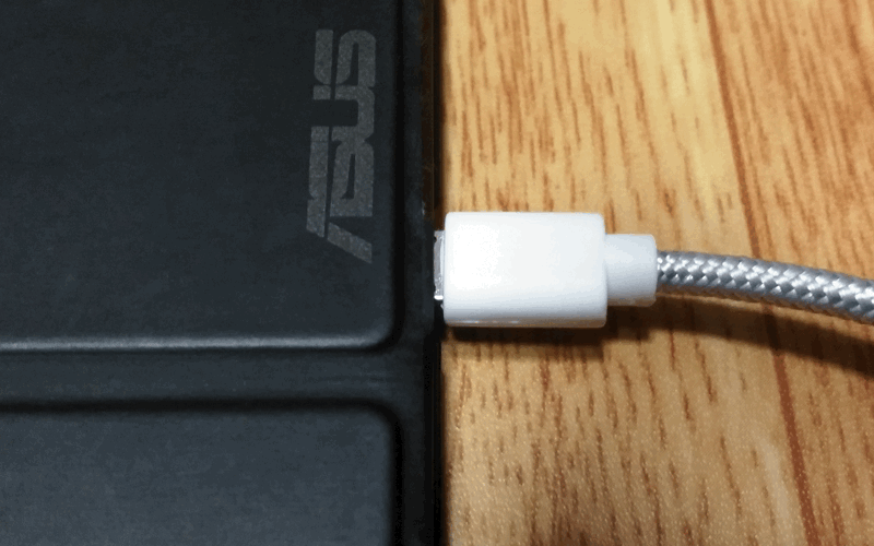 このケーブルの「Micro USB」側の金属部がちょっと長めなんです。