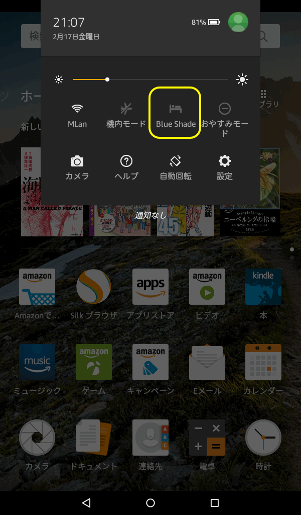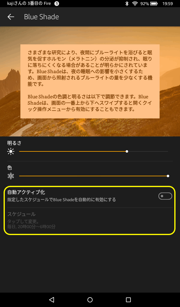 その前の「Fire OS 5.3.1」のアップデート時に「Blue Shade」の「自動アクティブ化」という機能が追加されました。