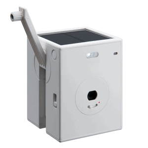 このカメラ、ユニークなのが、発電用のソーラーパネル、また、手回しの発電ハンドルがついていること。