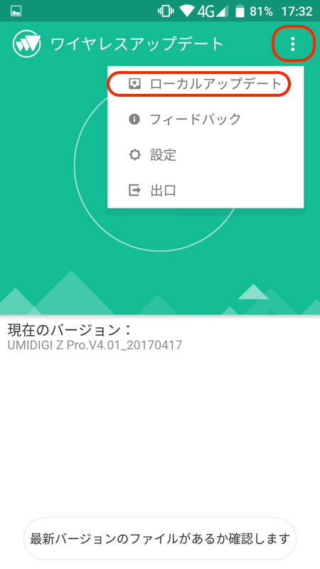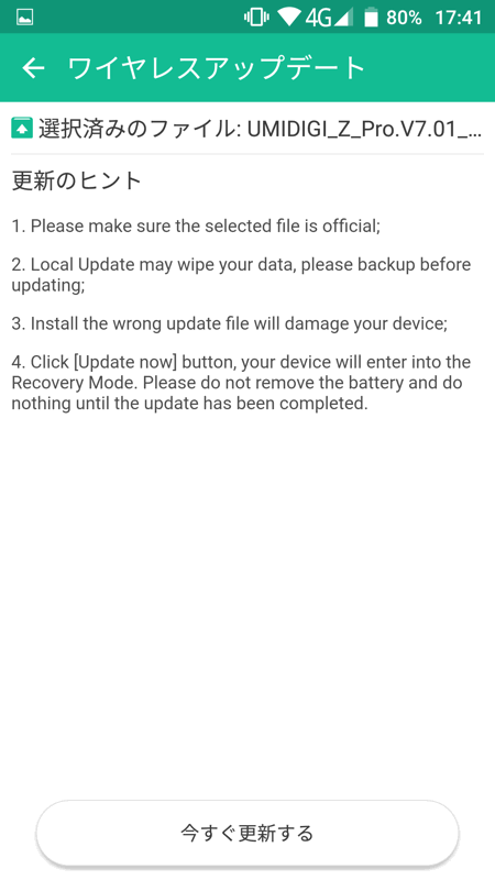 「UMIDIGI_Z_Pro.V7.01_20170710_update.zip」のファイルをダウンロードして、スマートフォンに転送。