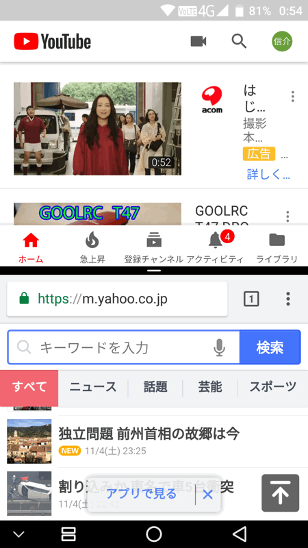 上に「YouTube」、下に「Chrome」を表示させてみましたが、スマートフォンのサイズだと2画面の必要はありません。それぞれが小さすぎて実用的ではありませんでした。