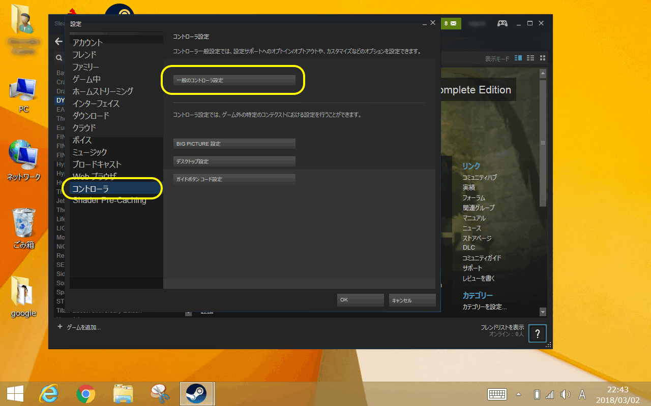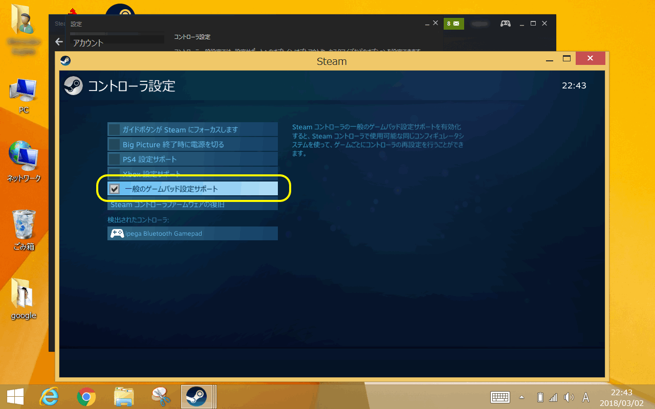 ちなみに、コントローラー設定に表示される「一般のゲームパッド設定」のチェックは、お好みでどうぞ。