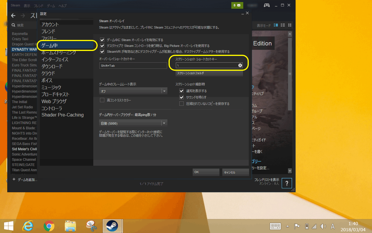 ゲームコントローラー設定が終われば、あとはプレイするだけなんですが、ついでに2つほど設定変更を。