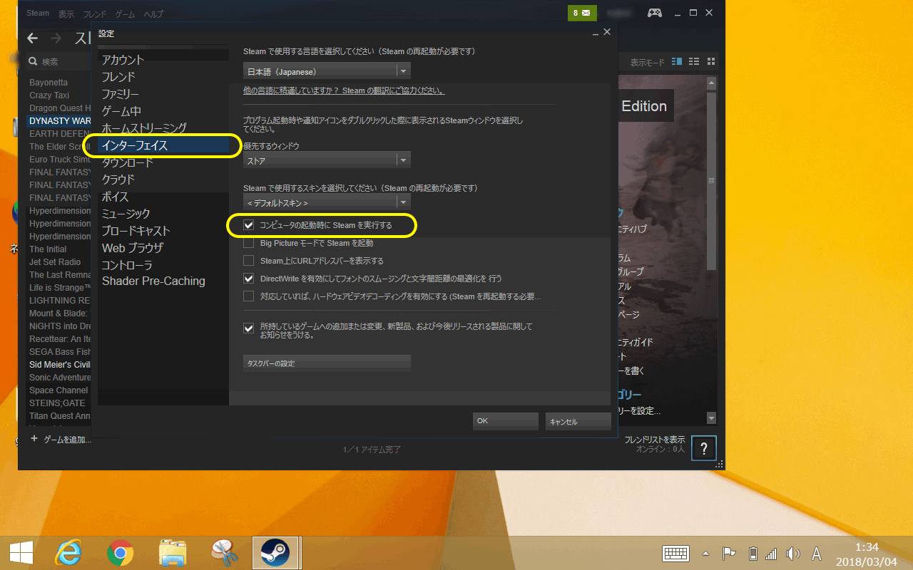 マシン起動時のSteamの起動を「OFF」にする