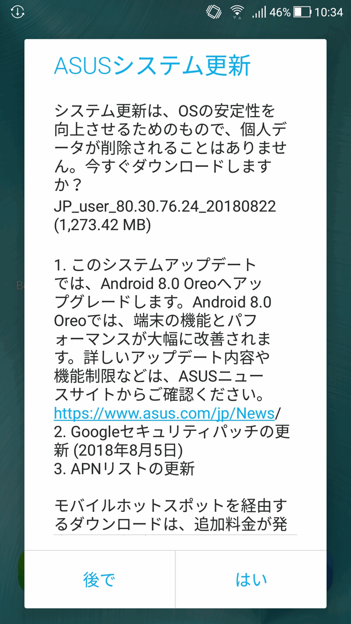 そうそう、色々試しているうちに「Android 8.0 Oreo」へのアップデートの告知がきました。