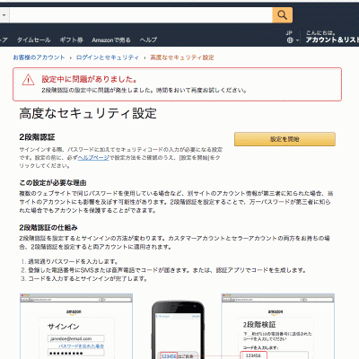ここで、「2段階認証の設定中に問題が発生しました。時間をおいて再度お試しください。」と表示されるのです。