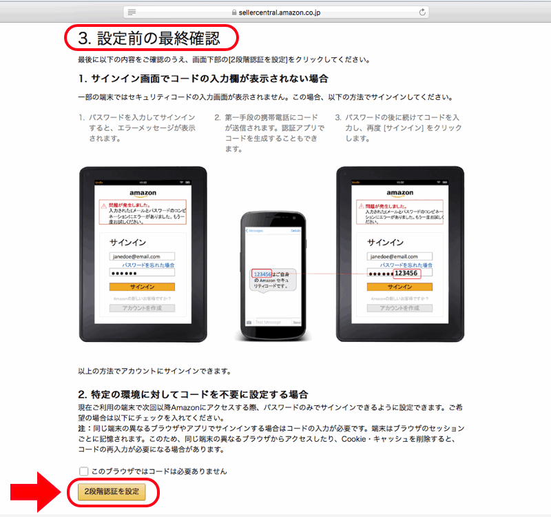 出品者として、「セラーセントラル」を利用するためには、「2段階認証」が必須だからです。