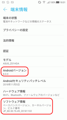 現在のシステムは、「Android 8.0.0」で、ソフトウェアのビルド番号は、「JP_80.30.76.49_20181102」です。