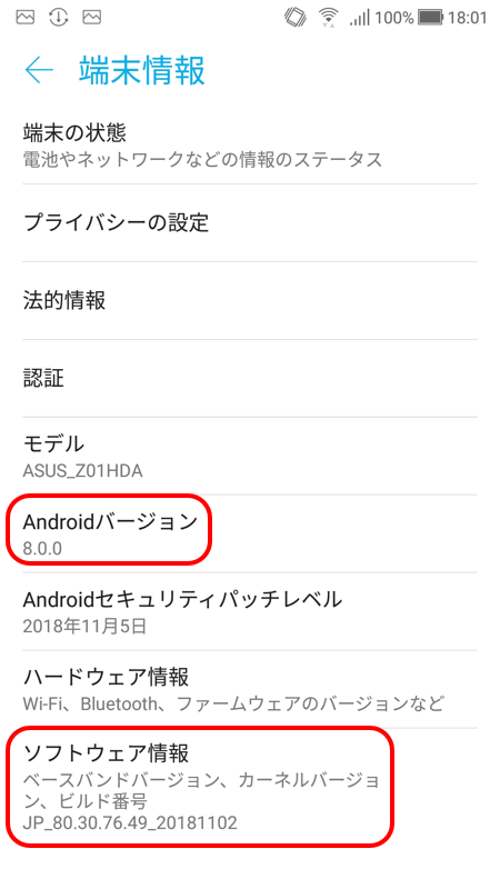 「Android」のバージョンは「8.0.0」から変わっていません。