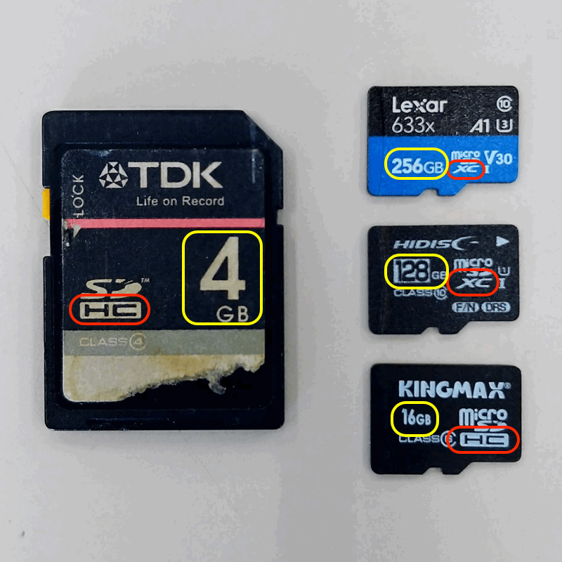 容量の面で注目するのは、「SD」や「microSD」という文字の下にある文字です。