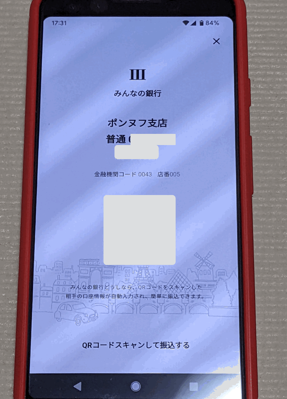 伏せている場所に、「口座番号」、「名義」、「QRコード」が表示されます。