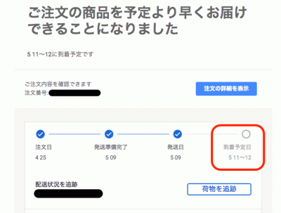 ところが、5月の連休明けの「5月9日」に、「ご注文の商品を予定より早くお届けできることになりました」というメールが届き、配送予定が「5月11日〜12日」に変更。