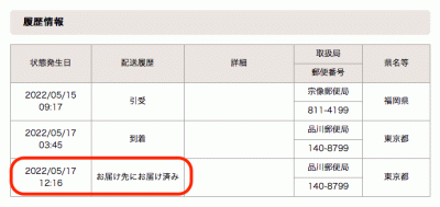 こちらは、「5月13日」に受け取りをしました。