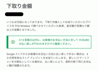 その際に、手持ちの「Pixel 3a」:見積もり額「¥25,000」を下取り手配しました。
