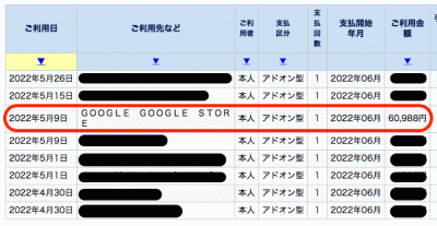 後日、クレジットカードの明細を確認してみると、「5月9日」に決済されていた「¥60,988」の取り消しが行われおり、新たに、下取り額との差額分「¥35,988」の決済が行われていました。