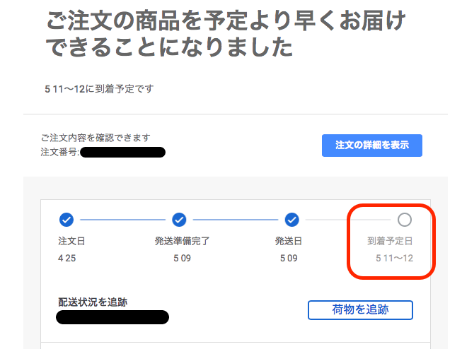 ところが、5月の連休明けの「5月9日」に、「ご注文の商品を予定より早くお届けできることになりました」というメールが届き、配送予定が「5月11日〜12日」に変更。