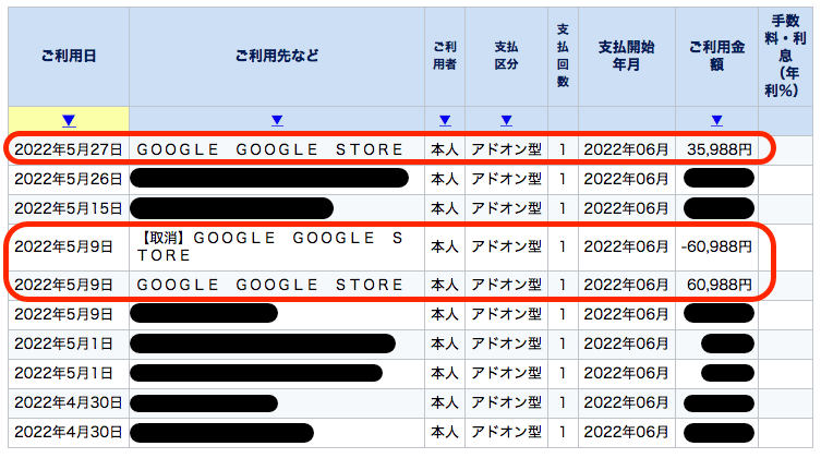 後日、クレジットカードの明細を確認してみると、「5月9日」に決済されていた「¥60,988」の取り消しが行われおり、新たに、下取り額との差額分「¥35,988」の決済が行われていました。