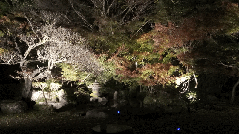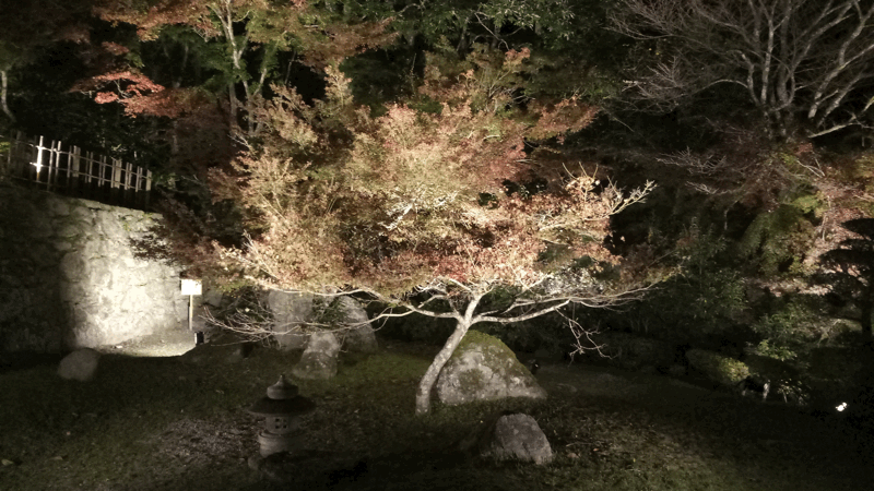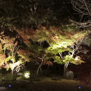 ライトアップされた屋敷の庭の木々は見応え十分です。