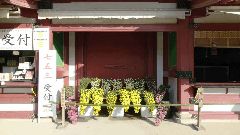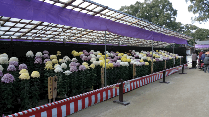 菊は、菊花展の会場だけではなく、本殿の横や社務所の横など、境内のいたるところに設置されていました。