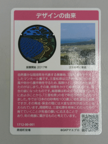 カードの記載によると、マンホールのデザインは、岡垣町を代表する景勝地、三里松原をデザインしているそうです。