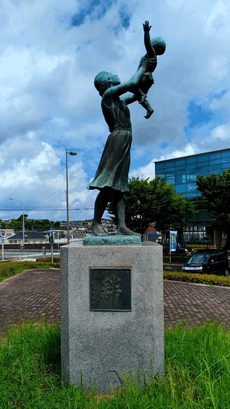 駅の正面には「絆」という銘の銅像がありました。