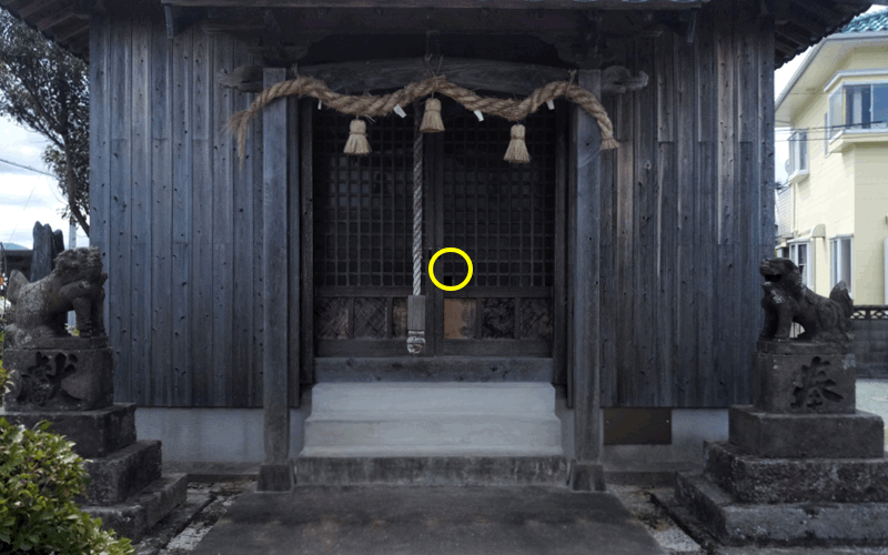 「賽銭箱」は外にはなく、下の写真の黄色の部分にあたる格子のガラスが一部取り外されており、そこから中に入れる形になっていました。