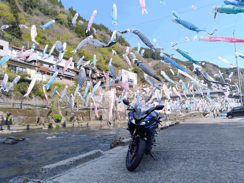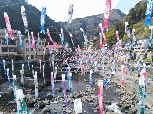 この時期の「杖立温泉」は、川にたくさんの「鯉のぼり」が泳いでいるのです。